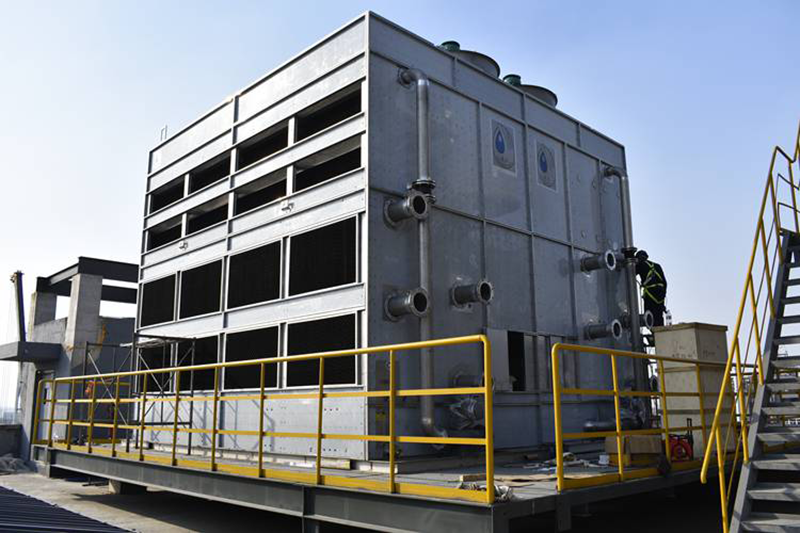 高溫工作流體進(jìn)入表冷器,廢熱通過(guò)盤管外壁與下落的噴淋水接觸進(jìn)行熱質(zhì)交換并與側(cè)面進(jìn)風(fēng)的干冷空氣垂直交替形成飽和的濕熱空氣。熱量由頂部風(fēng)機(jī)排出,水分則由特殊結(jié)構(gòu)的脫水器擋回集水槽循環(huán)使用。不同于逆流式,橫流式的噴淋水首先經(jīng)過(guò)PVC填料預(yù)冷,其換熱效果更加明顯。